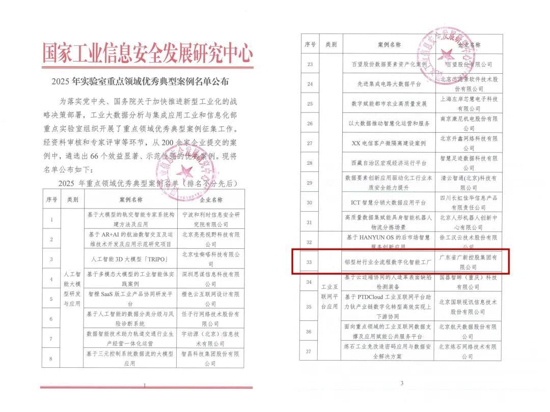 近期,国家工业信息安全发展研究中心正式公布“2025年实验室重点领域优秀典型案例”名单,广新控股集团凭借《铝型材行业全流程数字化智能工厂》项目成功入选股票配资门户平台,这是广新控股集团总部首次在制造业数字化转型领域获得国家级荣誉。